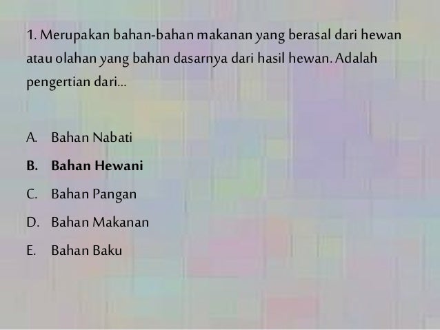 1 B Berikut olahan telur dengan proses mengeringkan telur hingga airnya hilang sebanyak mungkin dinamakan A telur asin B telur beku C pindang telur D bubuk telur 2 kriteria pemilihan kemasan yang benar kecuali A bahan kemasan tidak berbau dan aman bagi makanan B bahan ke kemasan awet C mempunyai daya tarik D pada kemasan memuat nama produk tanggal posisi kada uarsa dan